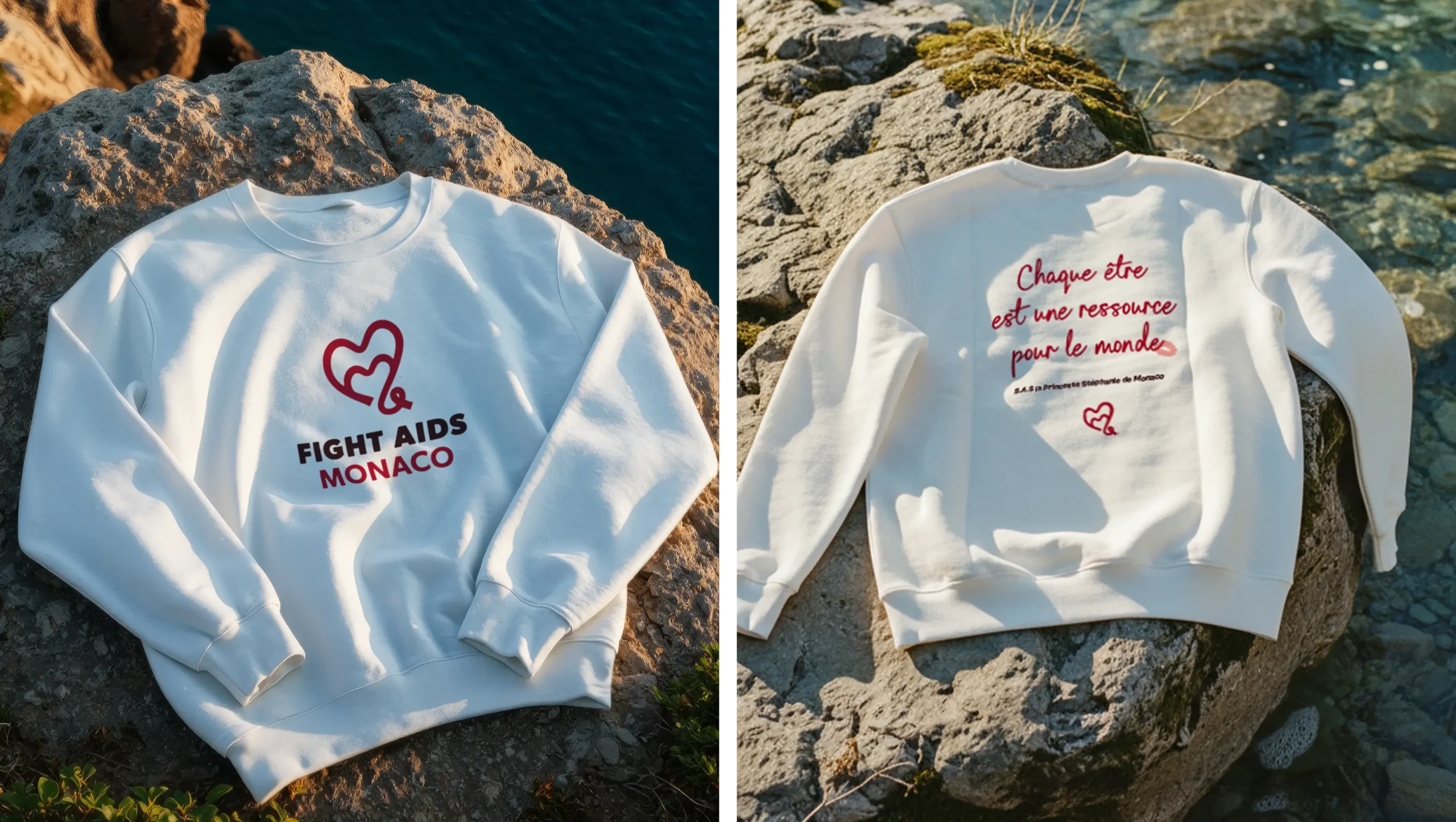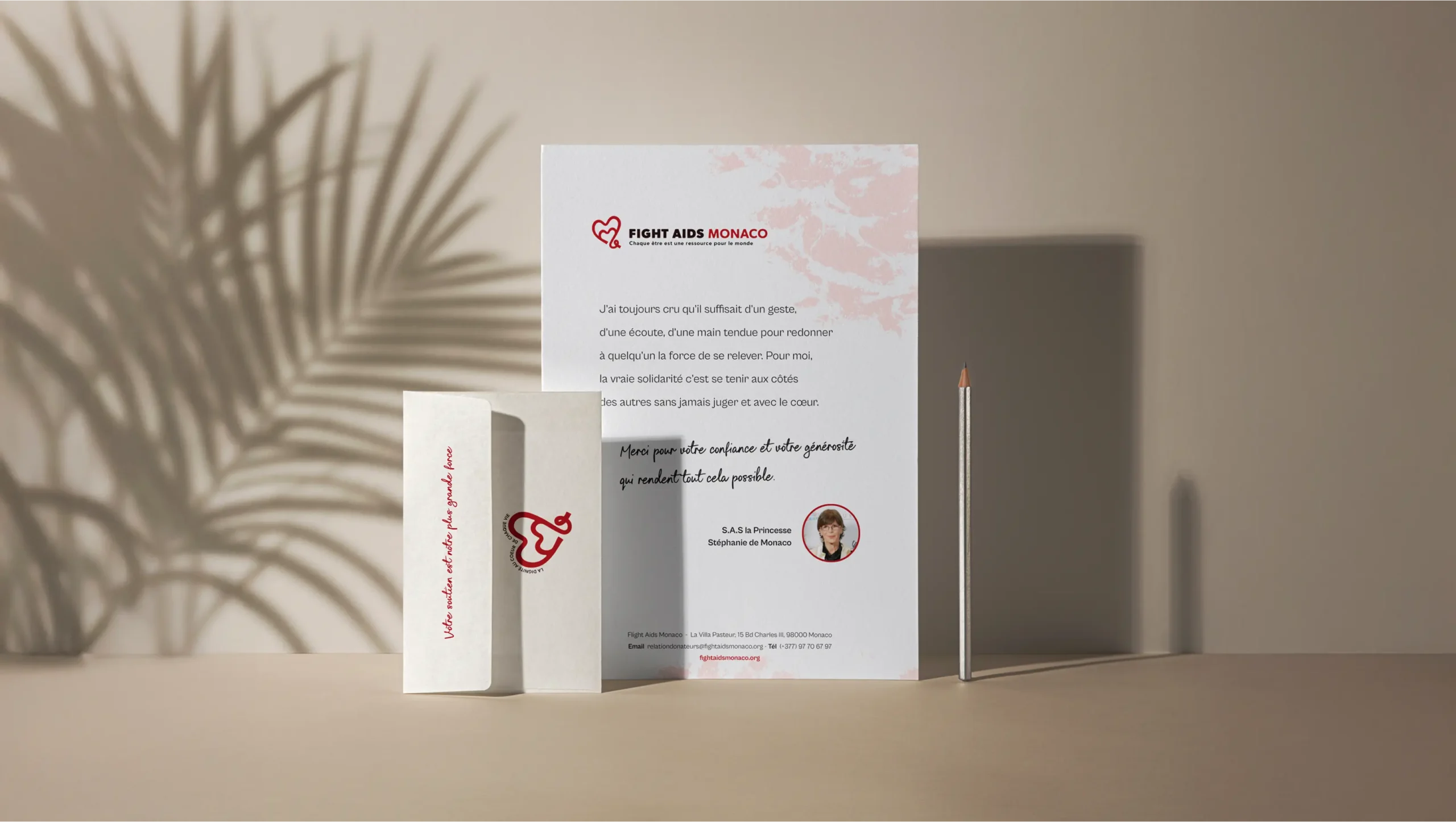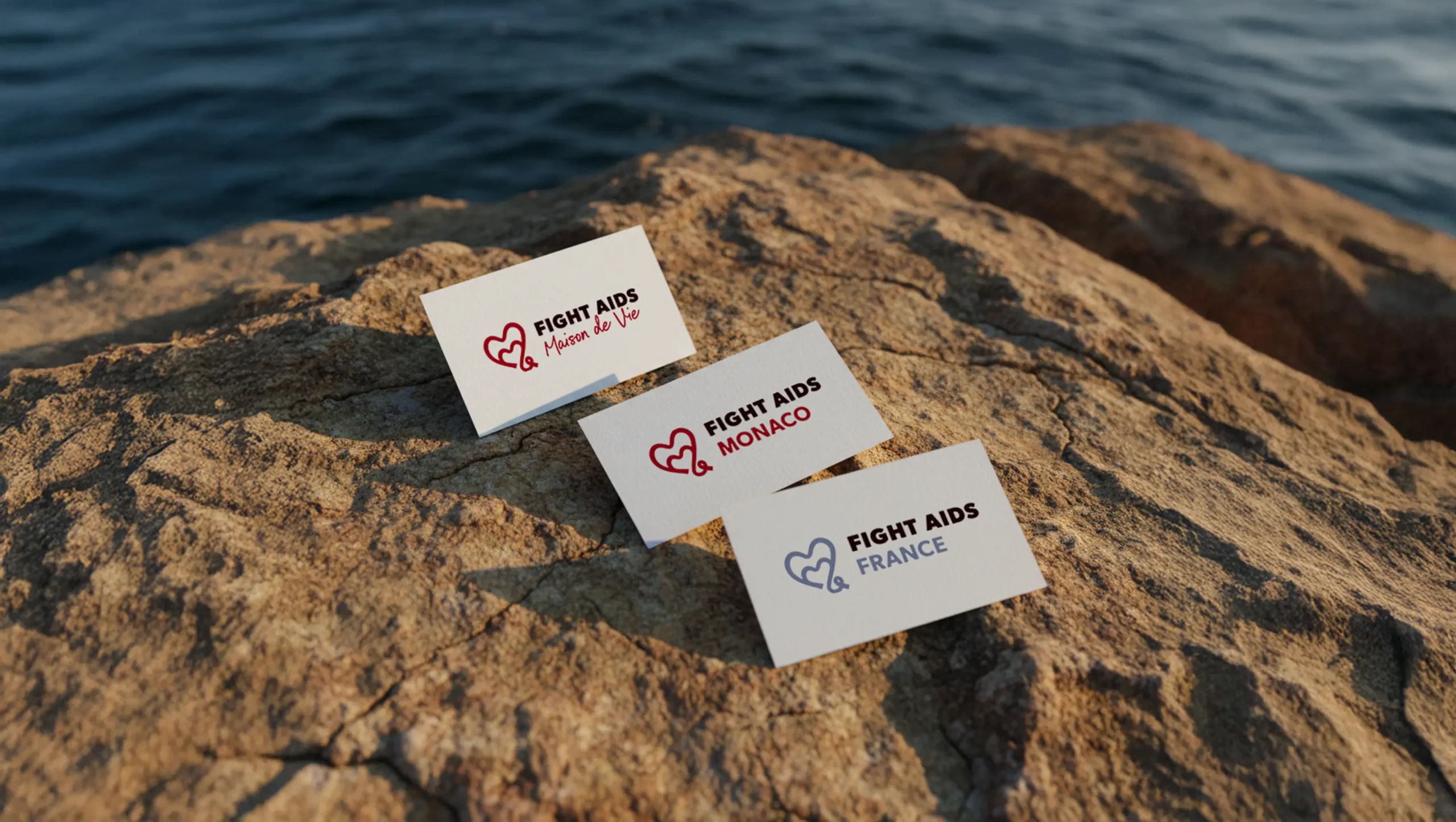 Les fonds et textures ont été conçus pour apporter de l’apaisement et structurer les supports avec subtilité. Les jeux d’ombres et de lumière, inspirés des ambiances méditerranéennes, évoquent la douceur du climat, la stabilité et le temps long. Ils créent des respirations visuelles et installent une cohérence d’ensemble, tout en ancrant l’identité de Fight Aids Monaco dans un territoire solaire, élégant et immédiatement reconnaissable.