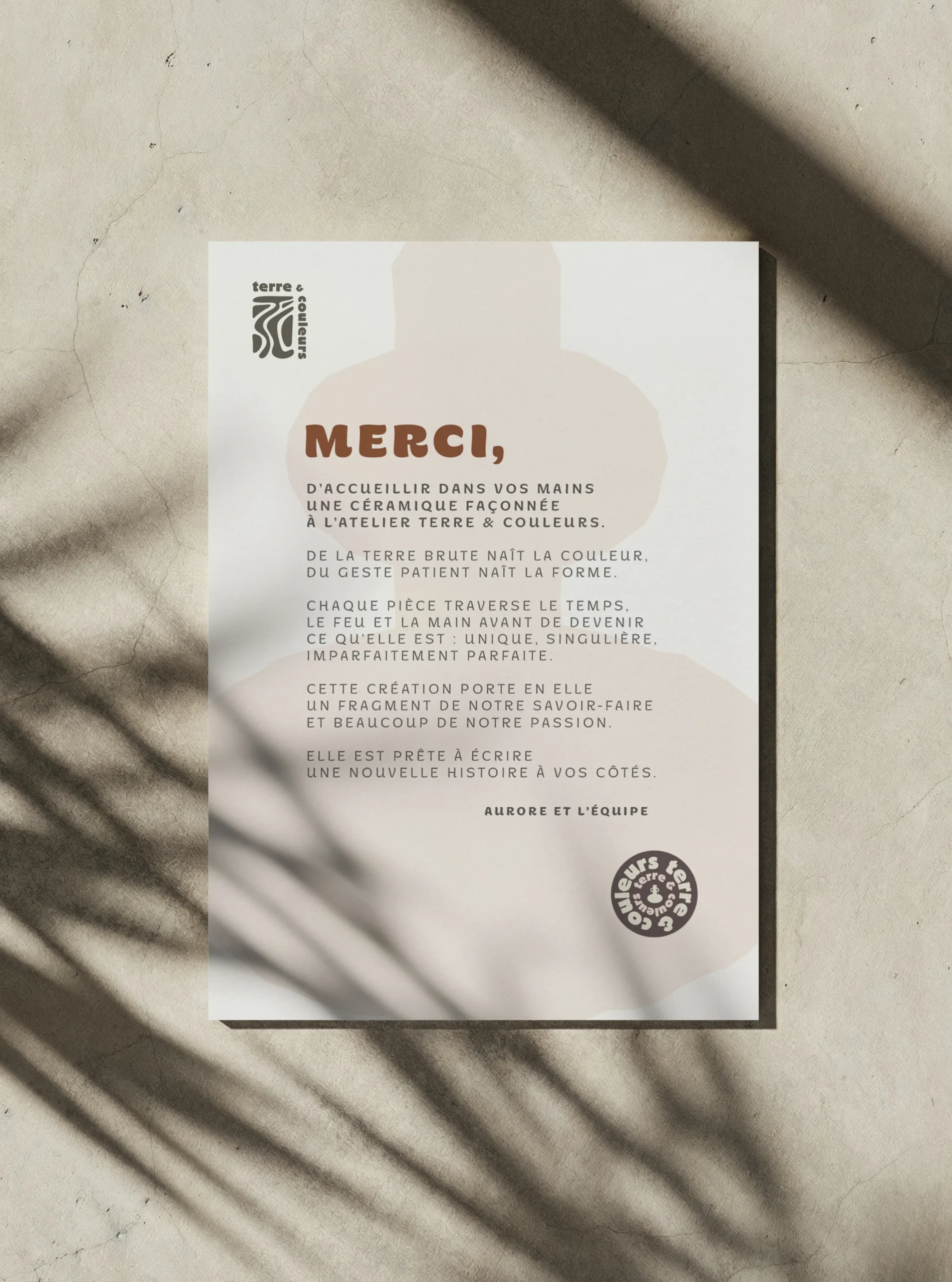 Terre Couleurs est né de l’envie de créer un lieu de céramique à la fois chaleureux et décontracté, où l’on peut apprendre, partager et se détendre. Le projet nécessitait une identité visuelle capable de refléter cet esprit convivial et artisanal, loin d’une image trop froide ou trop institutionnelle.